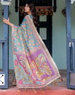 Aqua Blue Handloom Cotton Saree with Multicolor Floral Print & Royal Simha-Pakshi Pallu