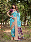 Elevate your traditional wardrobe with this captivating aqua blue Tussar silk saree, featuring intricate floral vine patterns in vibrant pink, yellow, and green hues. The design exudes a fresh and elegant vibe, perfect for festive occasions, weddings, and cultural events.