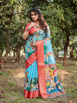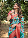 Aqua Blue Tussar Silk Saree with Vibrant Nature-Inspired Prints and Red Zari Border