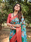 Step into elegance with this exquisite aqua blue Tussar silk saree, adorned with vibrant nature-inspired prints featuring intricate floral and leafy motifs in vivid red, yellow, and green hues. The lively patterns create a perfect harmony of tradition and modernity, making it an ideal choice for festive occasions, cultural celebrations, and weddings.
