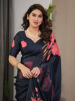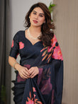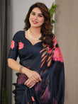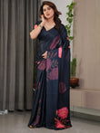 Midnight Navy Blue Satin Georgette Floral Printed Saree with Attached Blouse – Elegant Rose Bloom Designer Drape