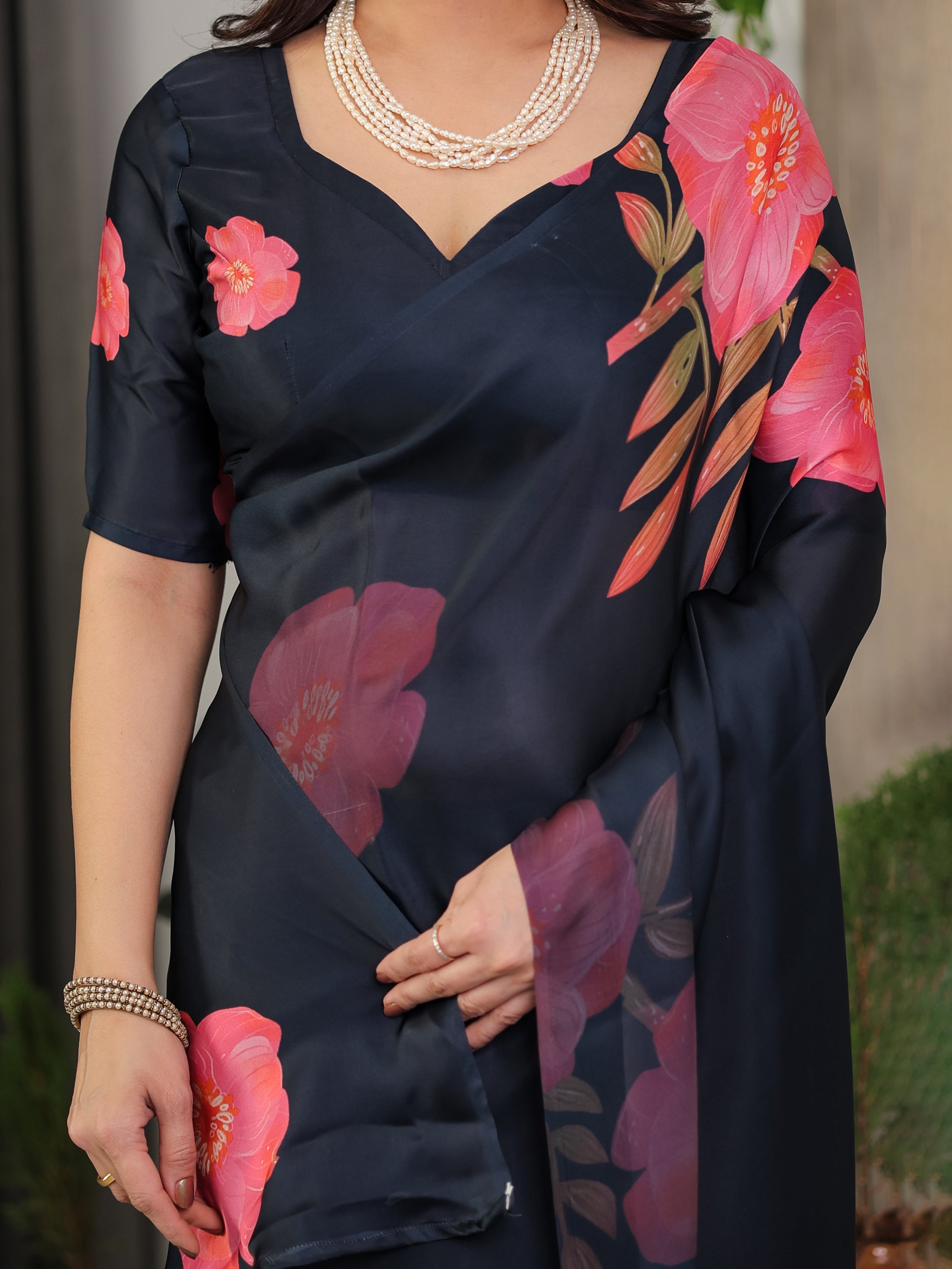 Crafted from premium satin georgette fabric, the saree features a rich navy blue base adorned with large rose-inspired floral prints in shades of coral pink and soft peach, complemented by delicate leaf detailing. The satin georgette texture lends a subtle sheen and graceful fall, creating a flattering drape that moves effortlessly with you.