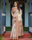 Celebrate elegance with this beige and rust handloom cotton-linen saree, a stunning creation that combines the grace of tradition with modern sophistication. The saree features delicate floral motifs across the body, creating a soft, ethereal charm. The rust-colored border is adorned with intricate floral and geometric patterns, enhanced with subtle zari highlights for a luxurious finish.