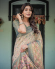 The highlight of the saree is the stunning pallu, which unfolds like a painting—vivid peacocks nestled among blooming florals, rendered in a medley of pastel hues including rose pink, saffron, lavender, and mint. Complemented by diamond-patterned borders and floral stripes in earthy green and rust, this saree captures the soul of artisanal storytelling.