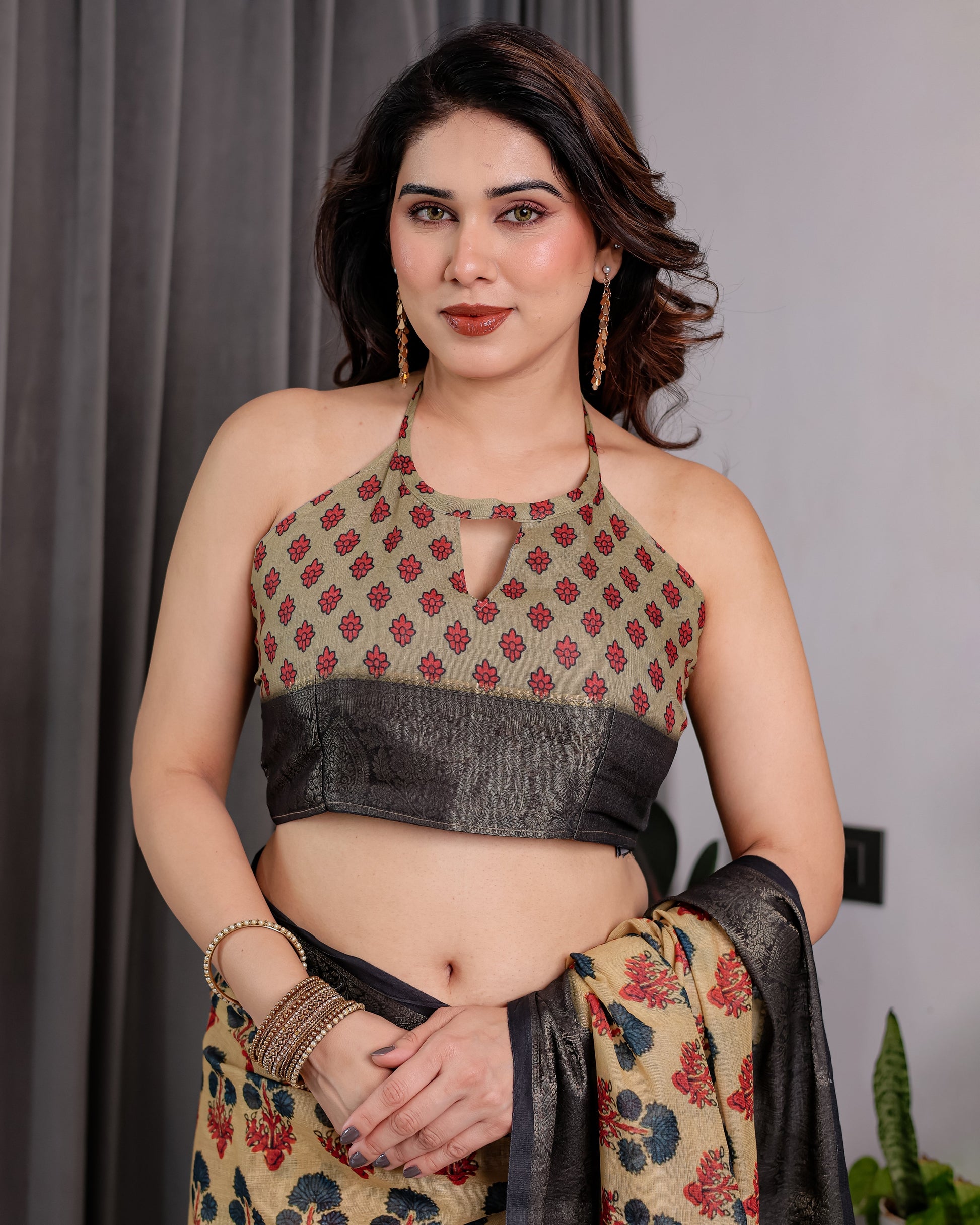 This saree includes a 0.8-meter attached blouse piece in matching print — versatile enough to be styled into halter, high-neck, or traditional sleeve designs as per the occasion.
