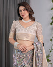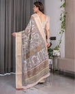 Immerse yourself in the vibrant spirit of tradition with this Beige Handloom Linen Saree, adorned with tribal figurines, peacocks, and nature-inspired motifs in subtle multicolor digital print. The pallu narrates a story of cultural heritage with its artistic blocks, including mandala-style designs, temple borders, and tribal dancer art—perfect for lovers of ethnic storytelling through fashion.