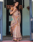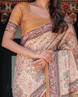 Beige & Maroon Handloom Cotton Saree with Floral Vine Print & Mythical Madhubani Cow Pallu