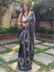 This elegant pure cotton linen saree features a striking black and white color palette, adorned with intricate floral patterns along the borders. The saree is finished with delicate tassels on the edges, adding a touch of traditional charm. Paired with a matching blouse, this saree is perfect for festive occasions or formal events. The soft, breathable cotton linen fabric ensures both comfort and style, making it an essential addition to your ethnic wear collection.