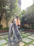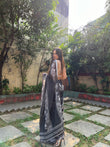 Black and White Pure Cotton Linen Saree with Intricate Floral Design and Tassels on Edges
