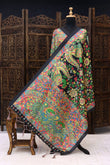 Make a bold artistic statement with this stunning Malai Silk Printed Dupatta, crafted for women who love vibrant colors and traditional storytelling. Set on a deep black base, this dupatta is adorned with an elaborate multicolor folk-inspired print, featuring graceful peacocks, paisley motifs, floral vines, and ornamental patterns that reflect timeless Indian artistry.