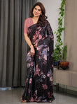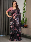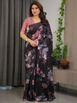 Black Satin Georgette Floral Printed Saree with Attached Blouse – Elegant Soft-Flow Designer Saree in Mauve Pink Florals