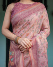 Step into grace and charm with this blush pink handloom cotton-linen saree, a masterpiece that beautifully blends tradition with elegance. The saree is adorned with delicate floral motifs in soft, earthy tones, creating a serene and sophisticated look. The contrasting pink border with intricate paisley and floral detailing enhances its overall allure.