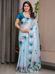 The fabric offers a smooth texture, lightweight feel, and fluid drape, ensuring effortless elegance and comfort throughout the day. This saree comes with a coordinated attached blouse in a deeper teal blue tone, designed with matching prints and a stylish back pattern that enhances the overall designer finish.