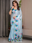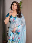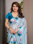 Sky Blue Satin Georgette Lotus & Crane Printed Saree with Attached Blouse – Serene Nature-Inspired Designer Drape