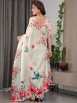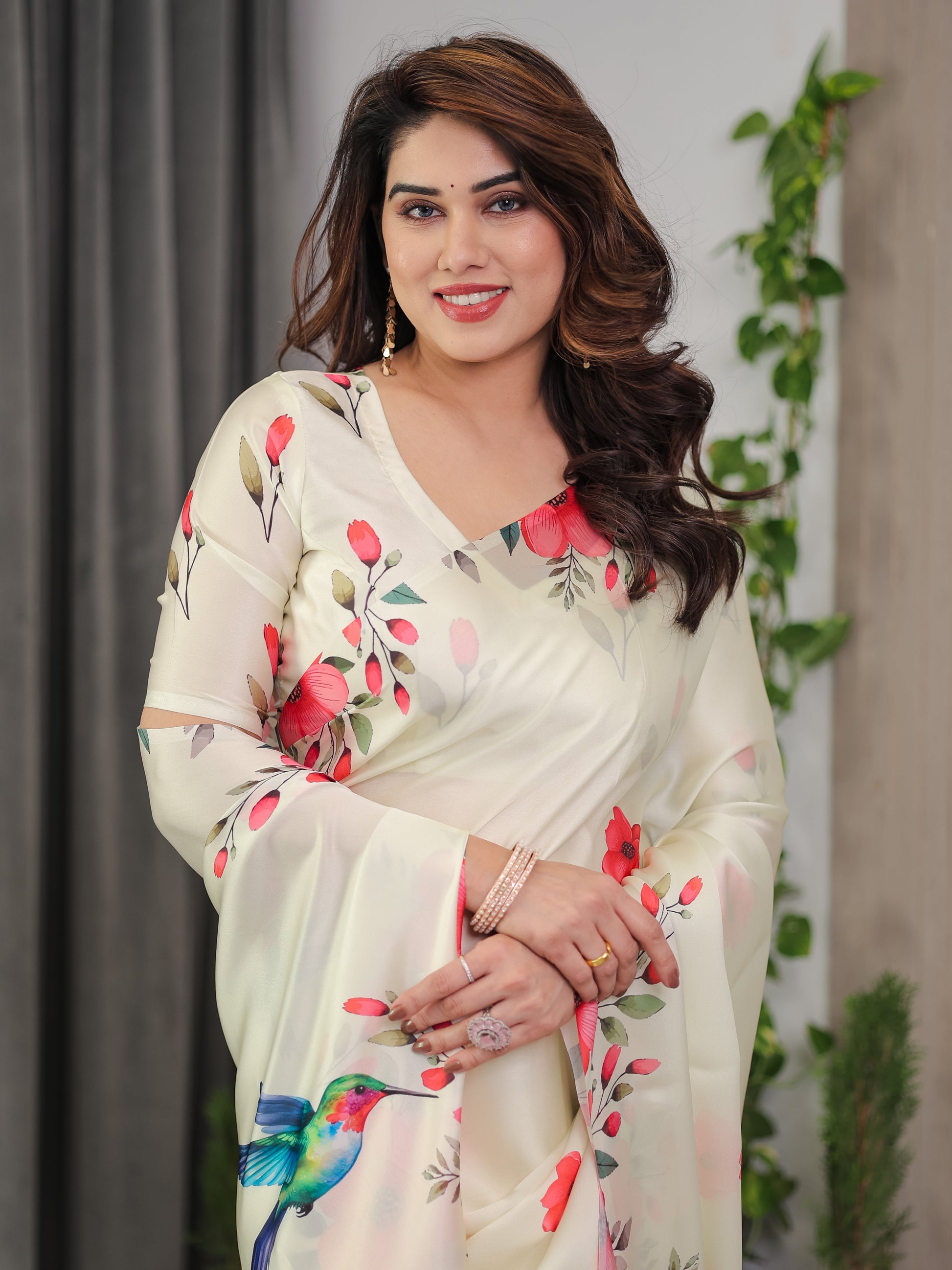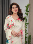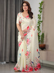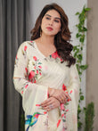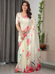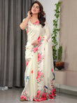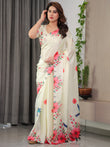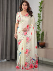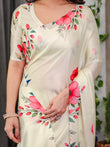 Ivory Cream Satin Georgette Floral & Bird Printed Saree with Attached Blouse – Elegant Nature-Inspired Designer Saree