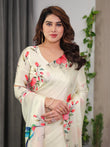 The saree features artistic floral prints in coral pink and green tones, beautifully complemented by a vibrant bird motif that adds a refreshing, contemporary charm. The subtle cream base enhances the print details, making the saree look elegant, soothing, and sophisticated. The design flows seamlessly across the body and pallu, creating a balanced and graceful silhouette.