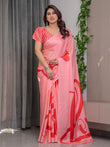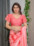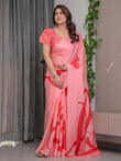 The saree features a soft blush pink base with a smooth gradient finish that adds depth and fluidity to the drape. Crafted in premium satin georgette, the fabric offers a lightweight, airy feel with a subtle sheen, ensuring comfort and graceful movement throughout the day or evening.