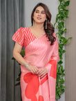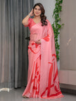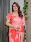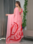 Blush Pink Satin Georgette Saree with Bold Red Heart & Love Typography Pallu and Attached Coral Red Geometric Blouse – 5.5 Meter Romantic Designer Saree for Valentine’s Day & Anniversary Wear