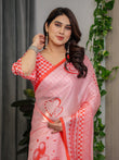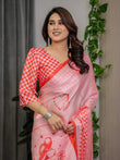 The saree features a soft blush pink base enhanced with a subtle checkered texture effect across the body. Delicate heart motifs and romantic accents are artistically placed, creating a graceful and contemporary look that feels light, airy, and feminine.