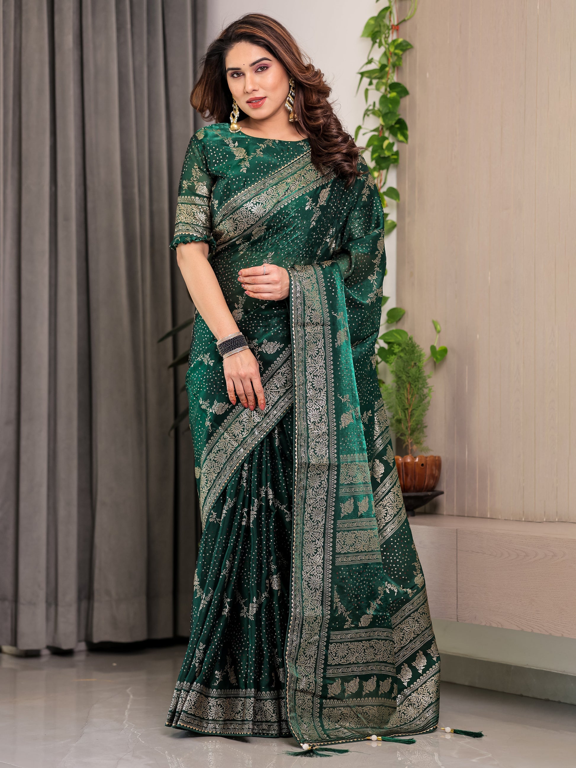 Bottle Green Fendi Satin Floral Block & Foil Printed Saree with Ornamental Border, Tassel Edges & Attached Blouse