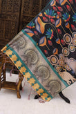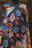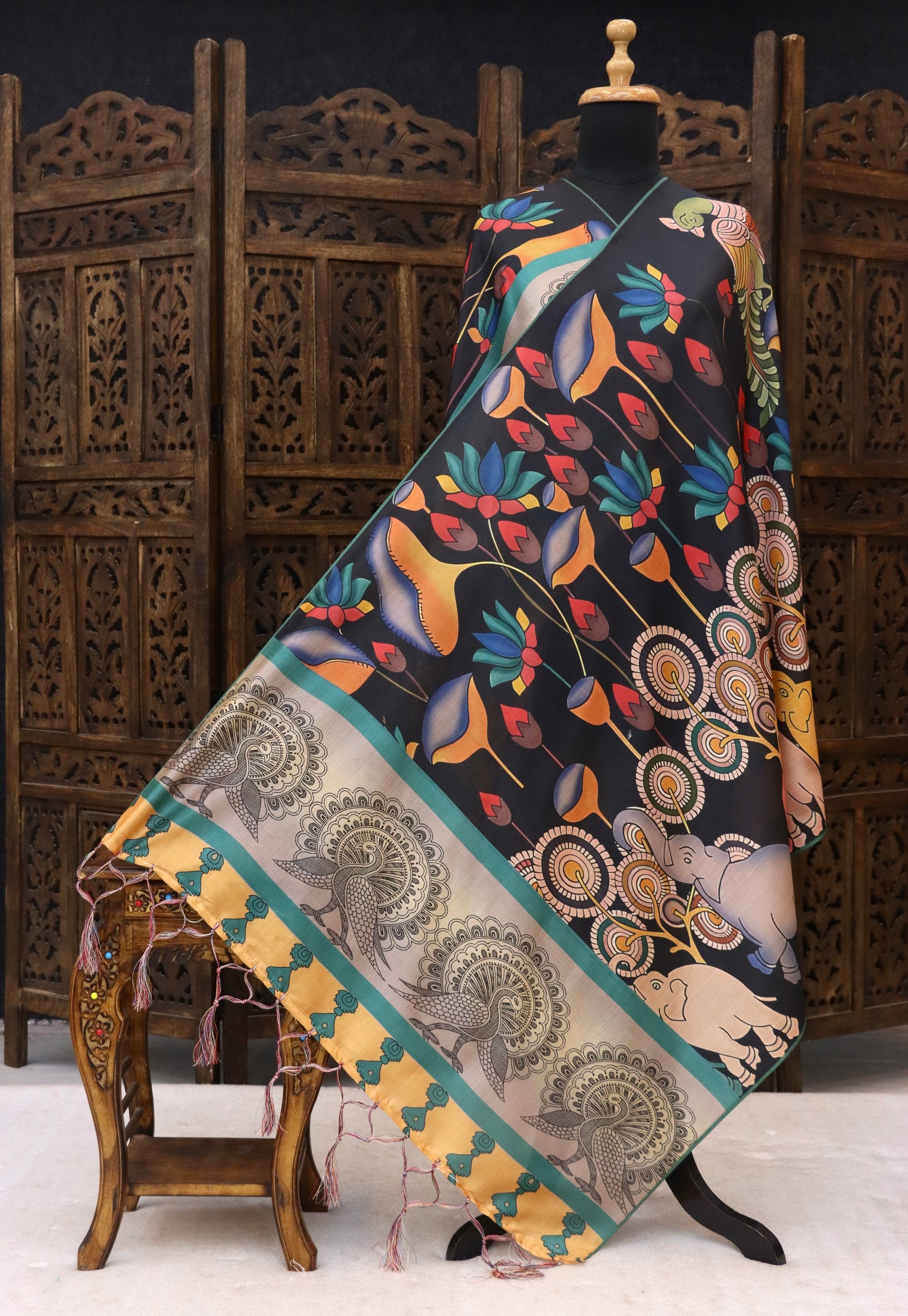 Charcoal Black Malai Silk Dupatta with Peacock, Elephant & Floral Folk Print and Contrast Border with Tassels