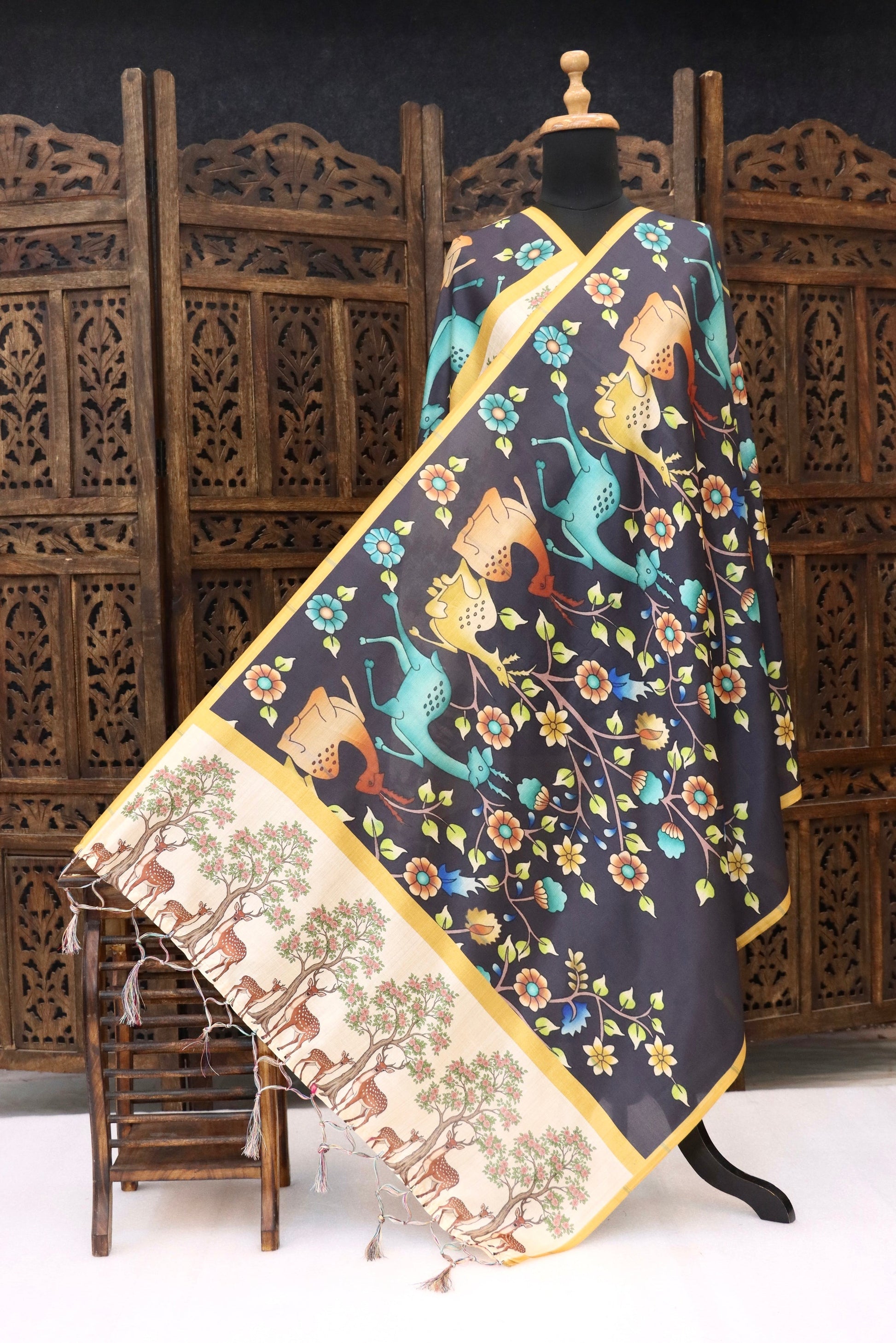 Charcoal Grey Malai Silk Dupatta with Tribal Deer & Floral Print Border – Elegant Folk Art Ethnic Stole