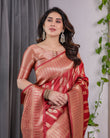 The grand zari pallu adds heritage flair, while the contrasting woven blouse piece completes the regal ensemble. Ideal for weddings, poojas, or festive celebrations, this saree makes a strong statement of elegance and cultural richness.