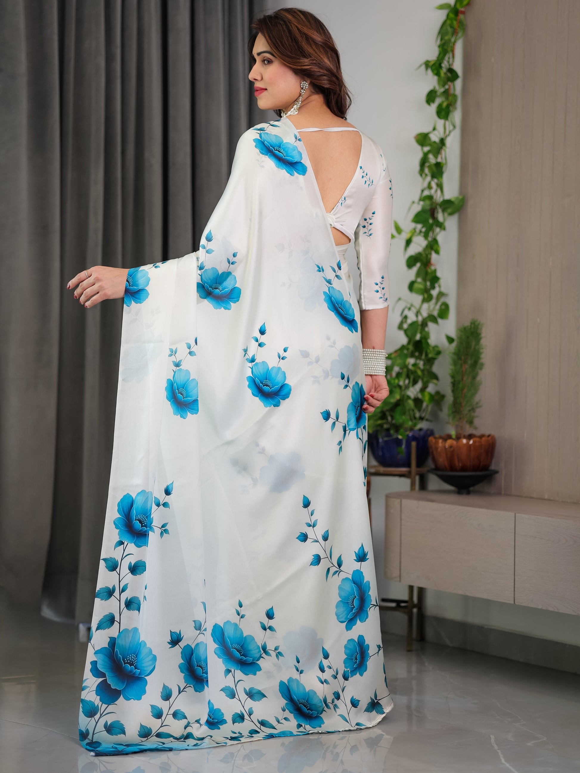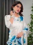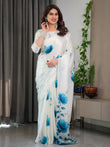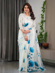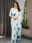 White & Blue Floral Satin Georgette Saree with Watercolour Bloom Print and Designer Back-Tie Blouse