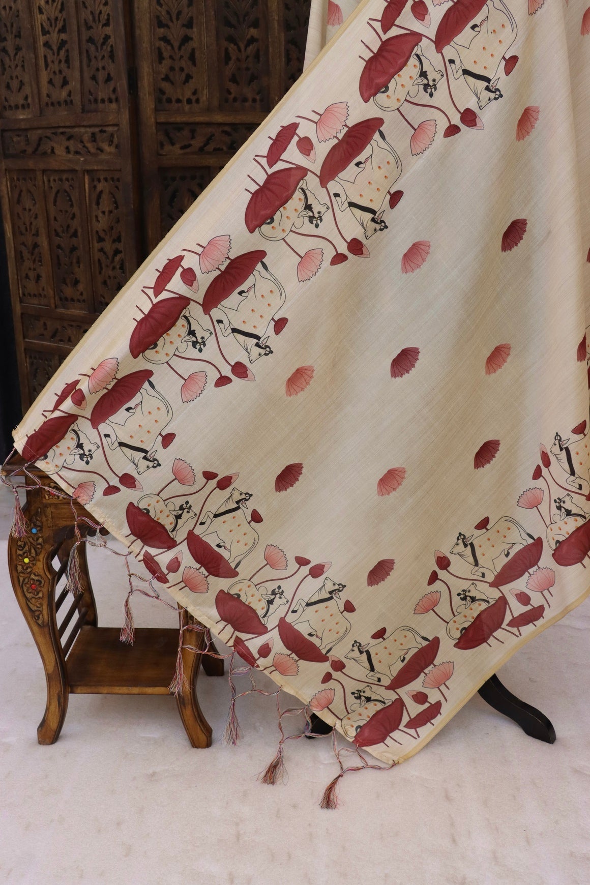 Cream & Maroon Cow Motif Printed Malai Silk Dupatta with Folk Border & Tassel Detailing