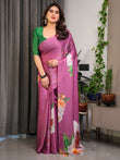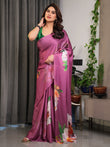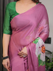 Pink Satin Georgette Saree with Bold Floral Prints & Matching Attached Blouse – Festive & Partywear Elegance