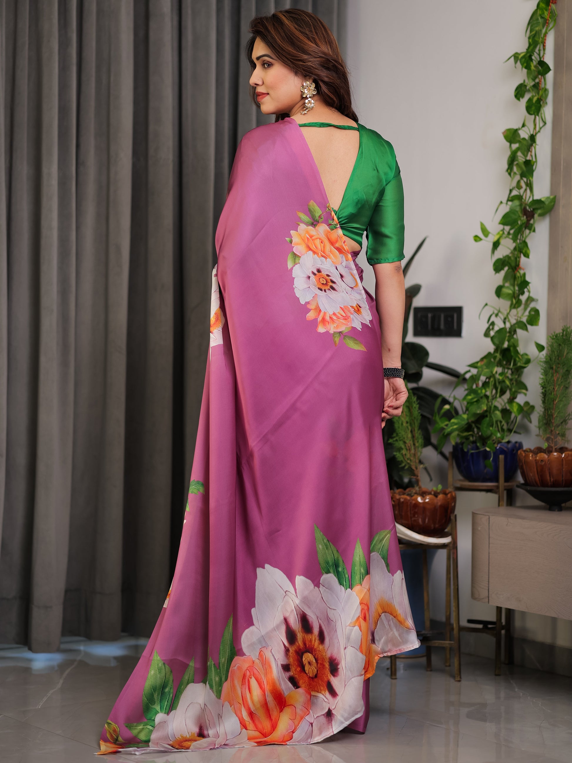 Styled here with a striking contrast green blouse, enhancing the floral freshness and elevating the overall silhouette.