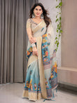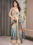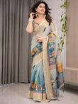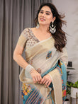 Cream & Teal Cotton Linen Saree with Zari Border & Royal Procession Digital Print | With Blouse Piece