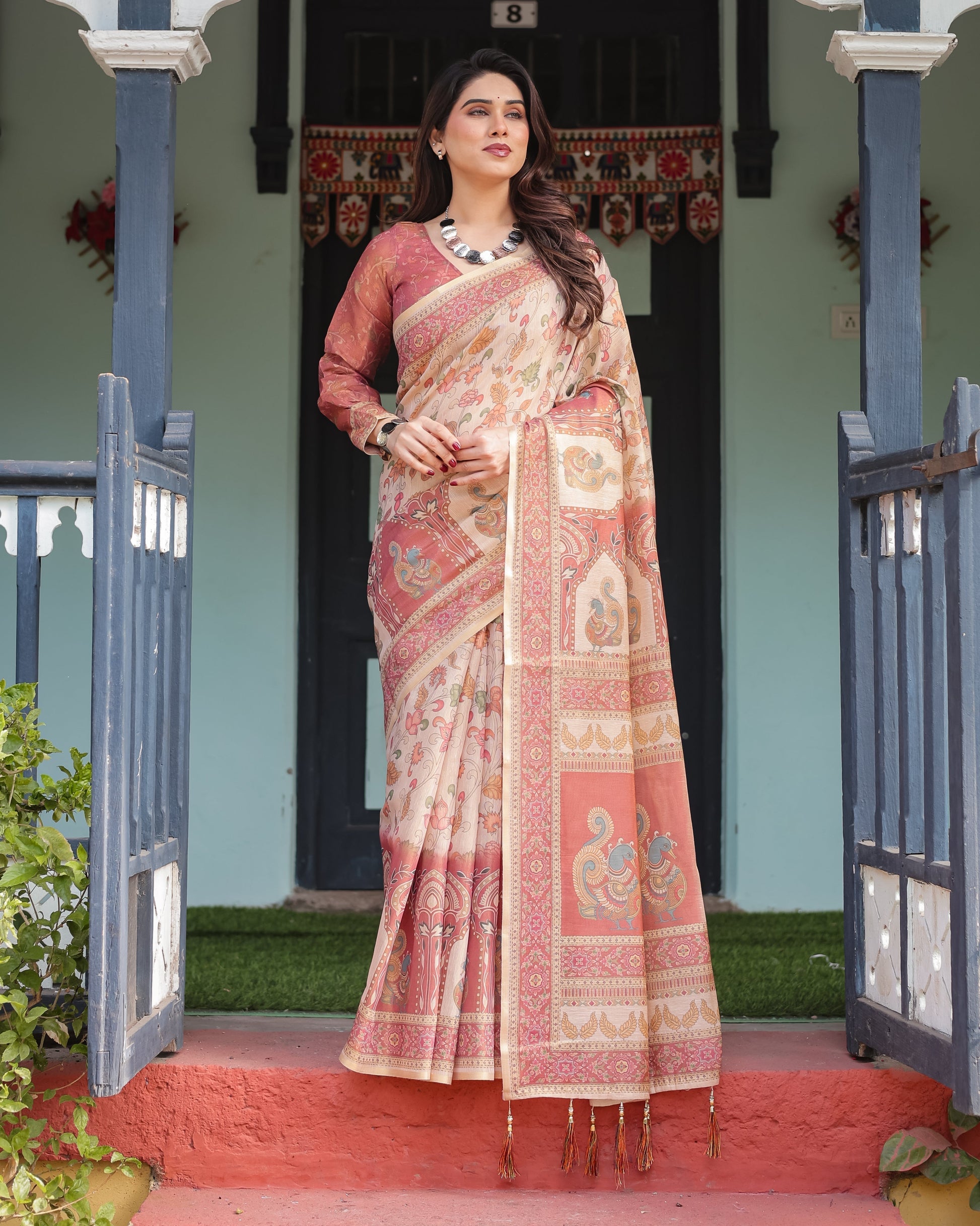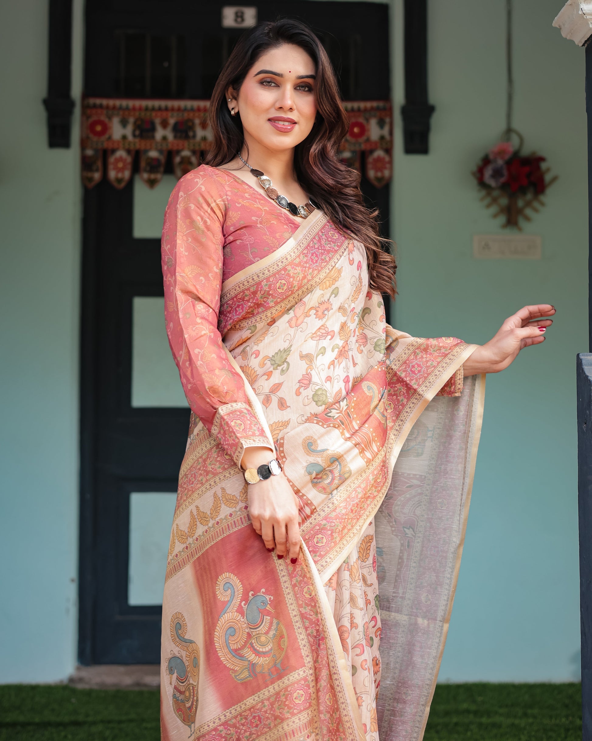 Immerse yourself in the beauty of traditional elegance with this Pure Linen Cotton Handloom Printed Saree in a serene cream hue, enriched with coral-toned borders and a delightful mix of peacock motifs and intricate floral patterns. Perfect for festive occasions, cultural events, or everyday sophistication, this saree is a versatile masterpiece.