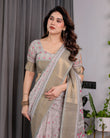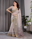 Slip into understated luxury with this dove-grey pure handloom linen saree, artistically scattered with soft pink ikat-style dot motifs that lend a subtle pop of colour against the neutral base. A wide antique gold zari border frames the drape, adding a refined shimmer, while the pallu graduates into elegant geometric rows highlighted by the same pink accents and finishes with hand-knotted tassels for a graceful swish.