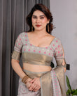 The set includes a 0.8-metre unstitched blouse piece in matching dove grey with complementary prints, allowing effortless customisation—be it a classic elbow sleeve, a chic sleeveless back-tie, or an elegant boat neck.