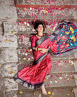 Add a touch of vibrance to your wardrobe with this stunning crimson red Tussar silk saree. The saree is adorned with traditional white Bandhani patterns, exuding timeless charm. It features an elegant charcoal gray zari border, intricately woven to enhance the saree's overall sophistication. The highlight is the vibrant pallu, showcasing bold, colorful depictions of traditional art forms with peacock and floral motifs, creating a mesmerizing visual appeal. Finished with tassels, this saree is perfect for weddings, festivals, and grand celebrations, offering a harmonious blend of cultural richness and contemporary style.