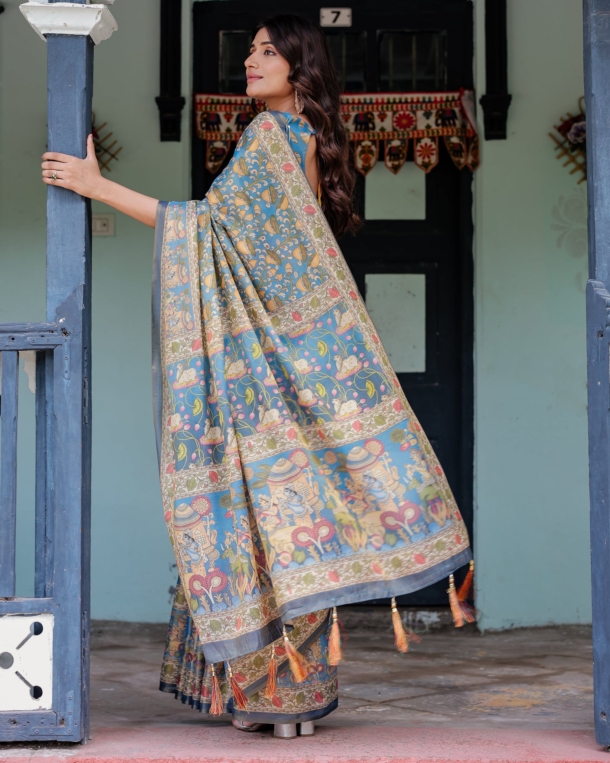 The saree’s spiritual essence comes alive in the pallu, featuring an intricate depiction of Lord Krishna playing the flute amidst lush nature and gopis, framed in floral temple-inspired borders. Muted tones of green, beige, and crimson elevate the divine artwork, while contrasting tassels add a festive finishing touch.