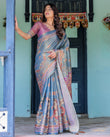 The saree’s pallu is a masterpiece in itself—featuring a multicolored tree of abundance, divine animal figures, and a violet canvas brimming with artistic symbolism. Subtle hints of mustard and rust orange on the borders and tassels add festive charm, while the body of the saree is painted in muted shades of blue with delicate floral impressions.