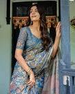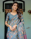Dusty Blue Handloom Cotton Saree with Floral Print & Pink Cow Lotus Motif Pallu