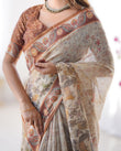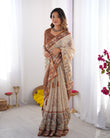 Elegant Beige & Brown Pure Linen Cotton Handloom Saree with Animal Motifs and Floral Prints