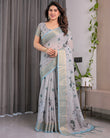Elegant Ice Grey Handloom Linen Saree with Floral Print, Gold Zari Border & Tassel Detailing | Attached Blouse Piece | 5.5m Saree + 0.8m Blouse