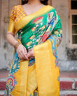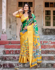 Golden Yellow Tussar Silk Saree with Vibrant Peacock Kalamkari Motifs