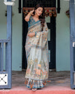 Saree Base: Icy Blue with Floral and Elephant Prints
