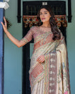 Paired with a coordinated blouse in a rusted maroon hue with complementing prints, this saree is ideal for lovers of cultural elegance and artistic textiles.