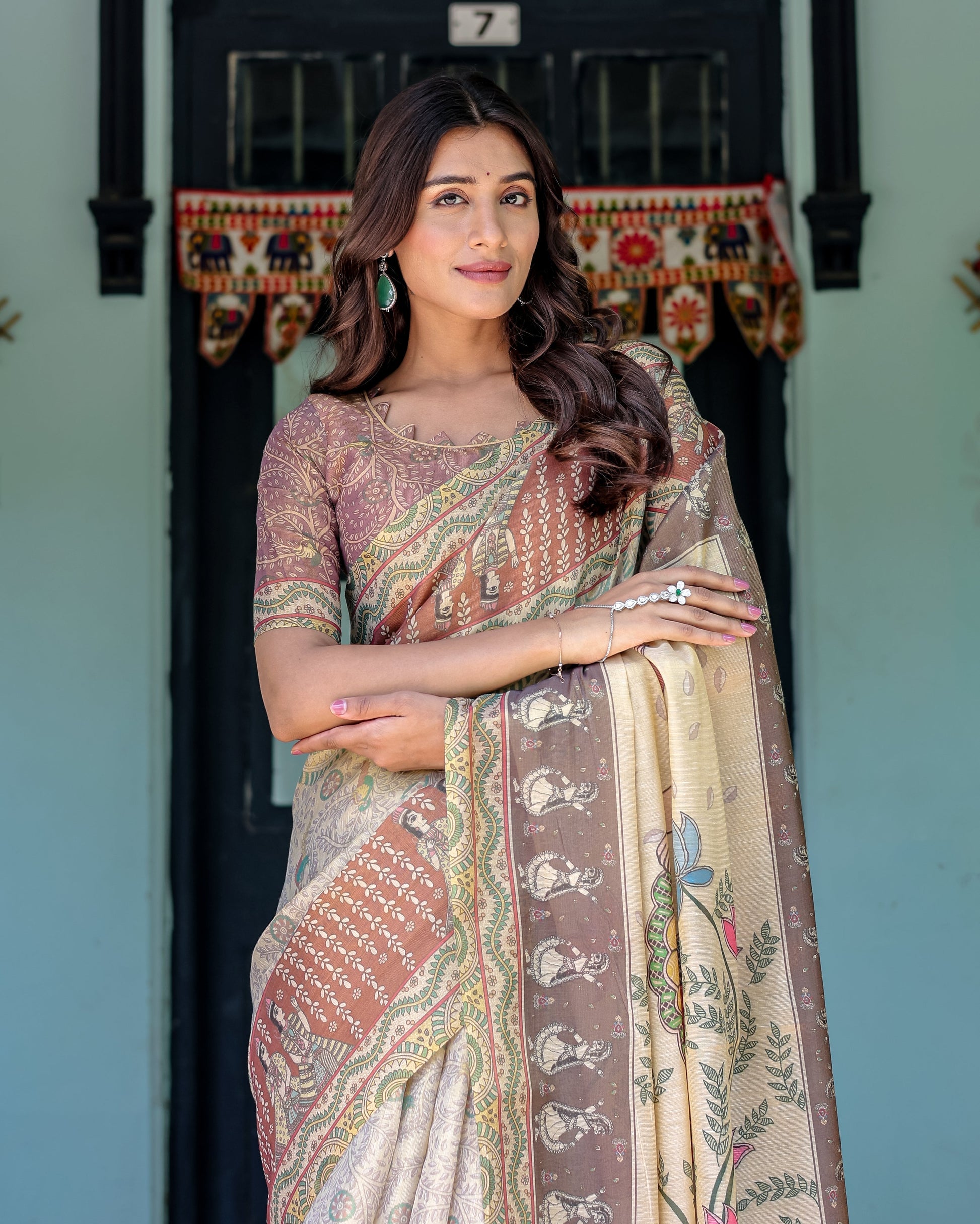 Ivory Brown Handloom Cotton Saree with Classical Dancer Motifs & Madhubani-Inspired Pallu