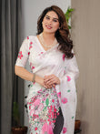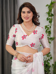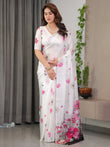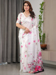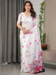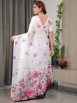 White Satin Georgette Floral Printed Saree with Pink Blossom Border & Attached Blouse – Elegant Lightweight Designer Drape