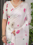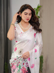 The saree features delicate scattered floral motifs across the body, beautifully complemented by a rich pink floral garden-inspired border with contrast black detailing, creating a striking yet elegant visual balance. The soft white base adds freshness and versatility, making it perfect for both daytime and evening occasions.