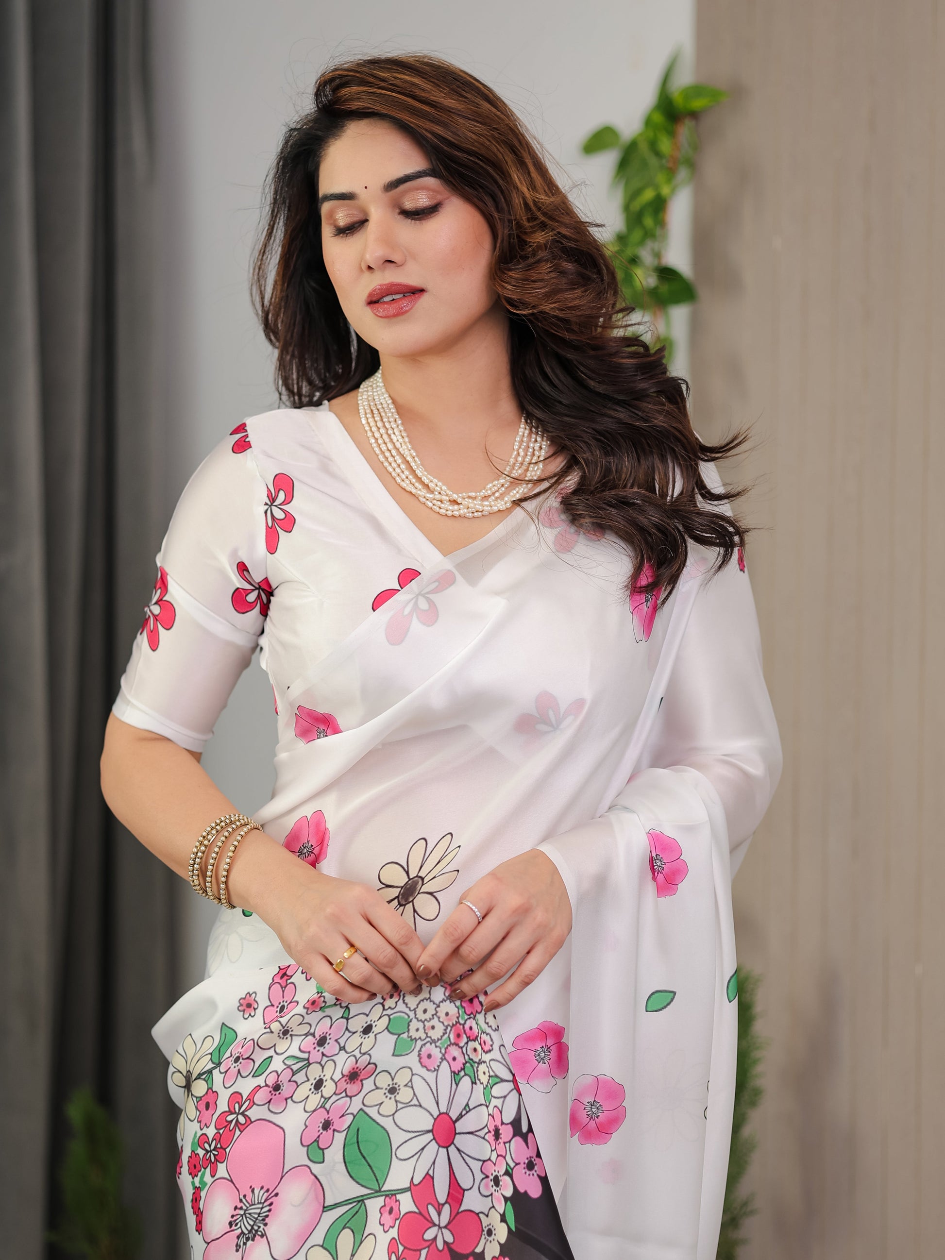 Paired with a matching attached satin georgette blouse featuring coordinating floral prints, this saree ensures effortless styling and a polished, ready-to-wear look. The lightweight fabric allows easy draping, making it ideal for long wear without compromising on style or comfort.