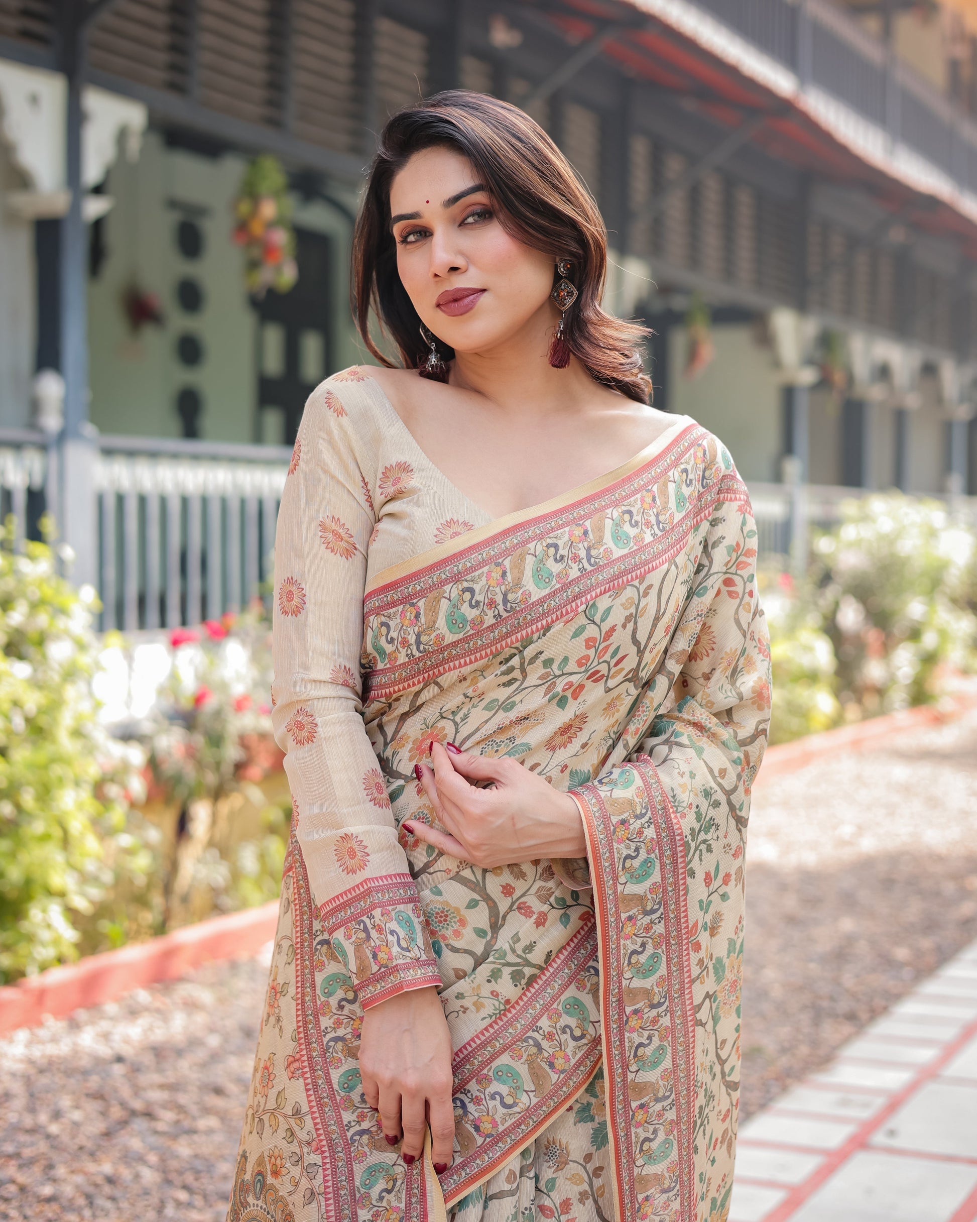 Indulge in the beauty of traditional handloom artistry with this exquisite ivory cotton-linen saree, adorned with vibrant floral and peacock motifs. The saree showcases an elegant interplay of earthy tones and intricate patterns, creating a design that is both classic and contemporary.