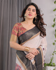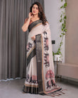 Ivory Handloom Linen Saree with Elephant Parade Print, Tree Motifs & Antique Zari Border | Tassel Finish | Attached Blouse | 5.5m Saree + 0.8m Blouse
